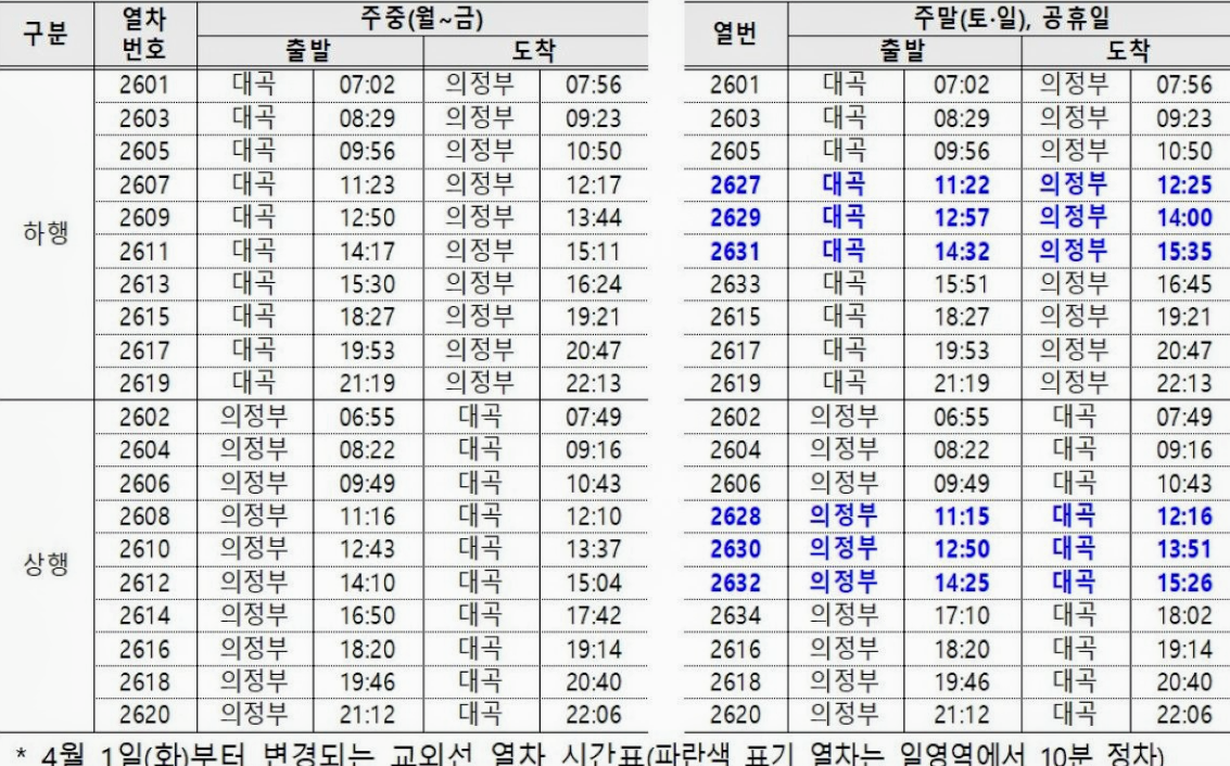 코레일은 2025년 4월 1일부터 교외선(대곡역~의정부역) 열차 운행 횟수를 기존 하루 8회에서 20회로 확대합니다. 이는 고객 편의를 위해 평일과 주말 운행 시간을 구분한 결과로, 평일에는 출퇴근 중심, 주말에는 여행 편의를 고려한 일정으로 운영됩니다.