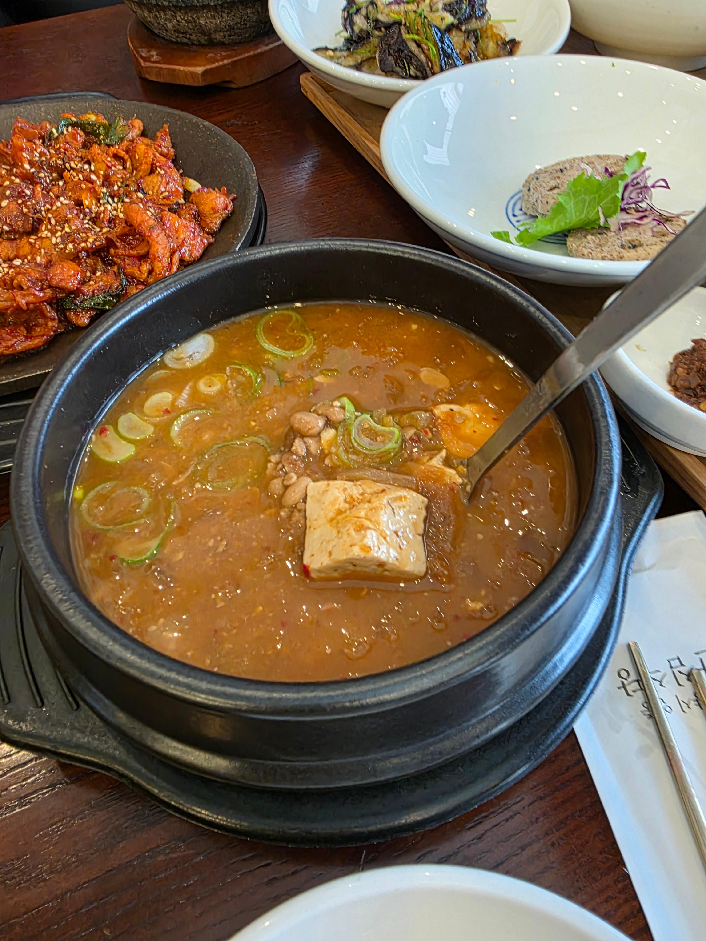 다음은 청국장이었는데요. 구수하면서도 진한 맛이 정말 좋았어요! 건더기도 푸짐해서 먹는 재미가 있었고, 청국장의 향이 강하지 않아서 처음 드시는 분들도 부담 없이 즐길 수 있을 것 같아요. 저희 가족 모두 너무 맛있게 먹어서 리필까지 했답니다.