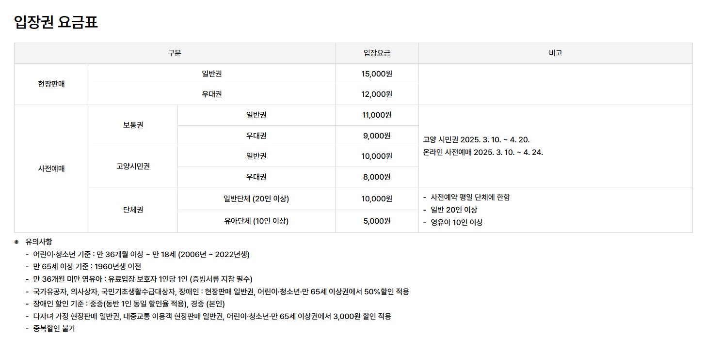 | 고양시민 일반권 | 10,000원 | 2025.3.10 ~ 4.20까지 예매 시 | ||