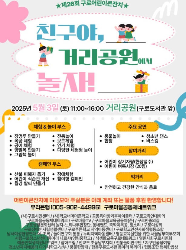 2025년 어린이날 어디 갈지 고민이라면? 서울과 수도권에서 열리는 무료 체험 행사와 가족 축제를 총정리! 5월 5일, 아이와 특별한 추억을 만들어보세요. 즐겁고 의미 있는 추억 만들고 오세요 💛