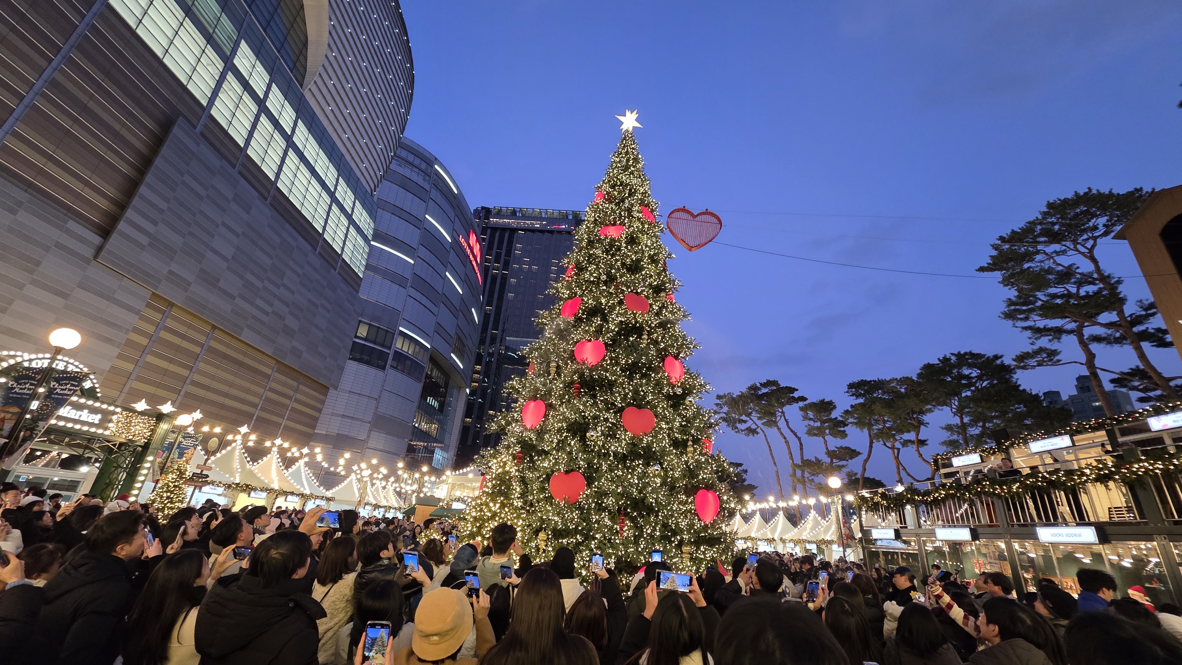 롯데월드타워 앞을 지키는 거대한 크리스마스 트리, 일명 '빅 위시 트리'는 필수 코스죠. 올해는 '하트 라이트 쇼'가 더해져 트리가 음악에 맞춰 춤추는 듯한 환상적인 모습을 볼 수 있습니다.