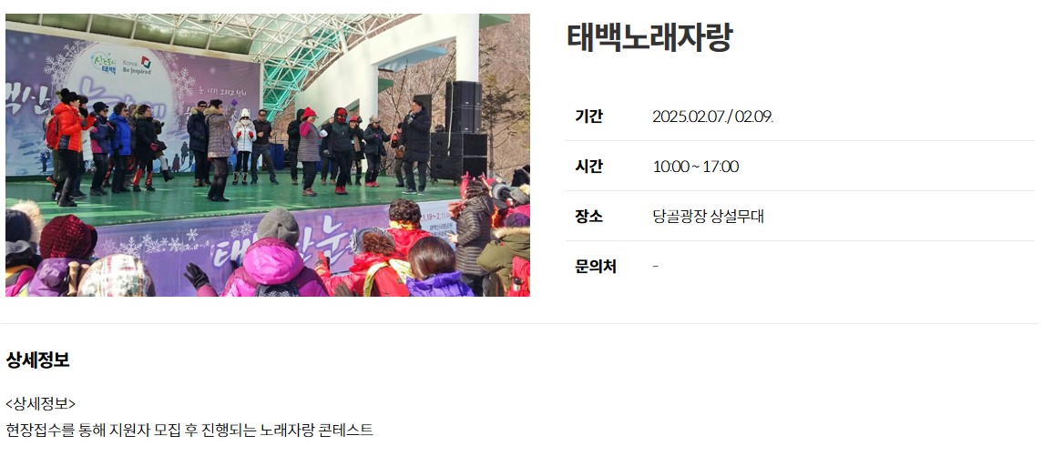 자세한 내용은 태백겨울축제 개막식 자세히 보기 글에서 확인하실 수 있습니다.