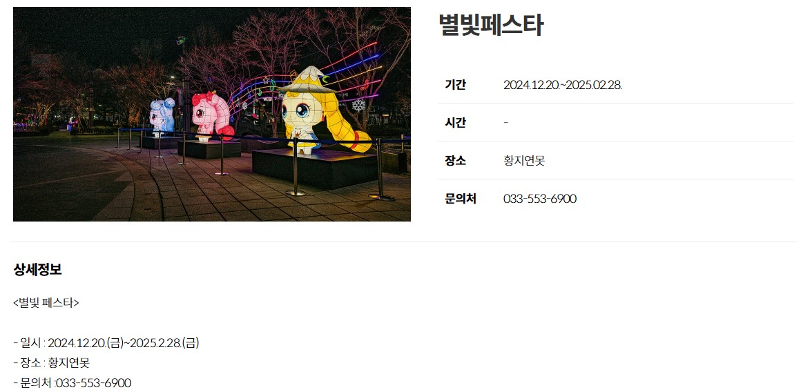 1. 별빛 페스타(Festa): 황지연못 일원에서 진행되는 야간 경관조명 축제로, 아름다운 겨울 풍경을 감상할 수 있습니다.